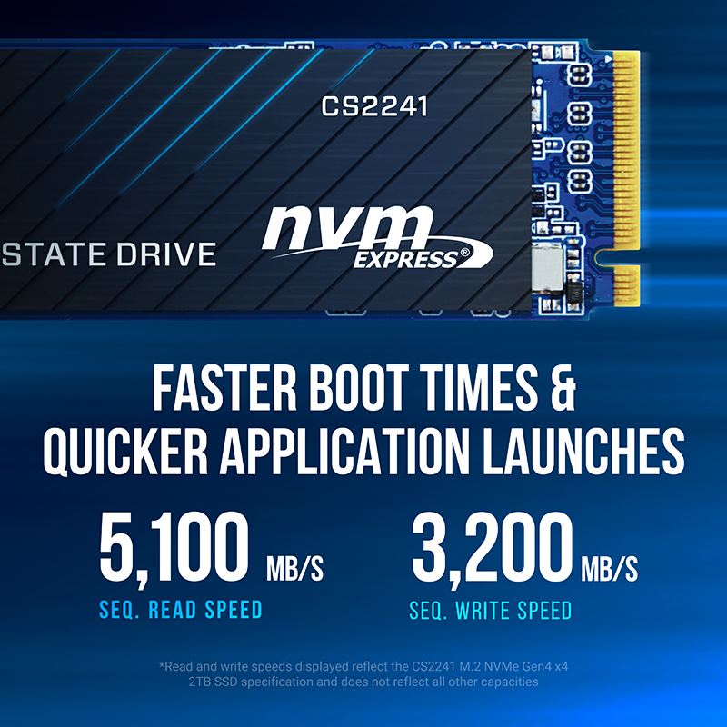 The CS2241 comes loaded with Gen4 x4 technoloy like TCG Pyrite™, 1.5 million hours MTBF, 3D NAND Flash, a 5-year limited warranty or TBW*, and more!