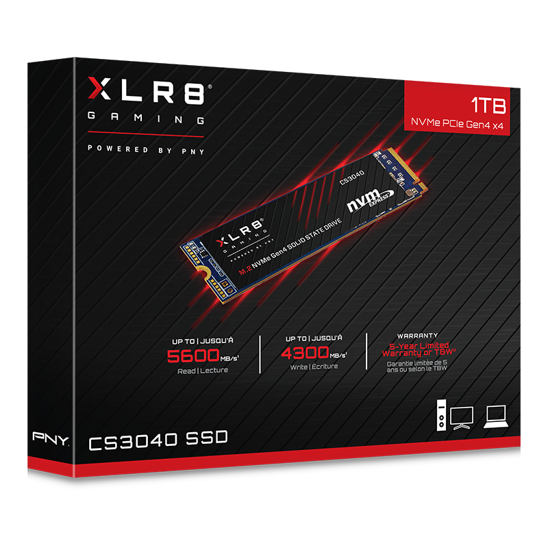 The CS3040 M.2 NVMe Gen4 x4 Solid State Drive is the ideal solution for PC enthusiasts, gamers, and video rendering professionals to upgrade to the latest in NVMe technology. It is designed to be an ultra high performance SSD to deliver the performance you demand. Boot up in seconds, enjoy lightning fast application launches, and incredible system performance. The PNY XLR8 CS3040 is highly durable, less likely to fail, and features a 5-Year Limited Warranty or TBW*. *For full details visit www.pny.com