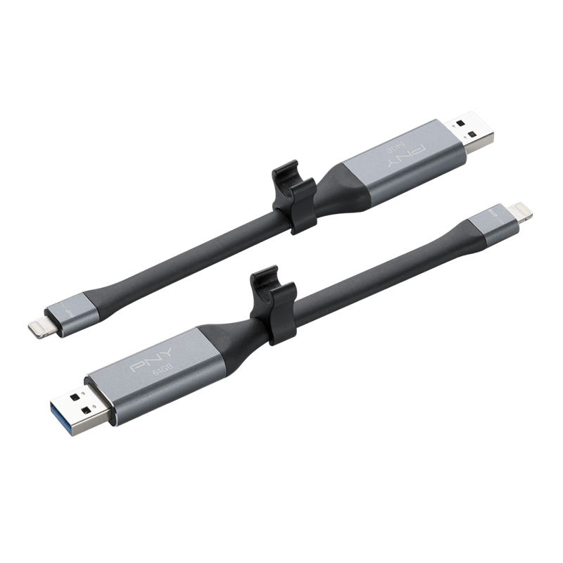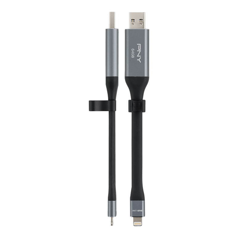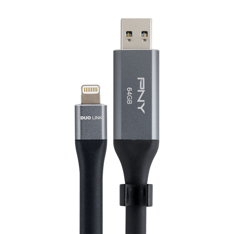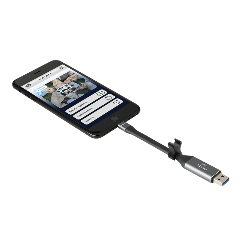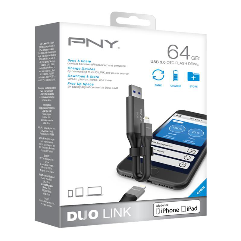 Free up space on your iOS devices by transferring videos, photos, music and more to the PNY DUO LINK iOS USB 3.0 OTG Flash Drive for iPhone and iPad. With read speeds enabled by Superspeed USB 3.0, the DUO LINK iOS USB 3.0 OTG Flash Drive enables you to sync & share content between devices, back-up contacts, download & store videos, photos, and more via the free, easy-to-use app, DUO LINK 4. This app enables you to access your digital content anytime, anywhere direct from the DUO LINK iOS USB 3.0 OTG Flash Drive. You can also charge your iOS devices by connecting DUO LINK to a power source and then connecting it to your devices.