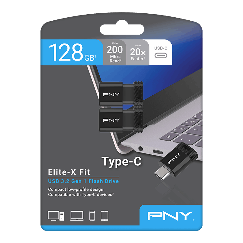 With advanced read speeds of up to 200MB/s and write speeds up to 100MB/s, the Elite-X Fit Type-C® is up to 30x faster than standard PNY USB 2.0 Flash Drives.²