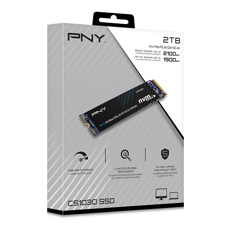 The PNY CS1030 M.2 NVMe SSD is an excellent choice for an NVMe upgrade from a SATA based solid state drive (SSD) or traditional hard drive in an NVMe enabled desktop or laptop computer. The CS1030 drive is designed to be an upgrade from conventional SATA based storage to take advantage of the high bandwidth of the NVMe interface to help realize faster boot times, quicker application launches, and better overall system performance. Do more in less time with NVMe; boot up, power down, and load applications up to 4 times faster than with SATA based SSD’s. With no moving parts, the PNY CS1030 M.2 NVMe SSD is highly durable, less likely to fail, and supports a 5-Year Limited Warranty or TBW.