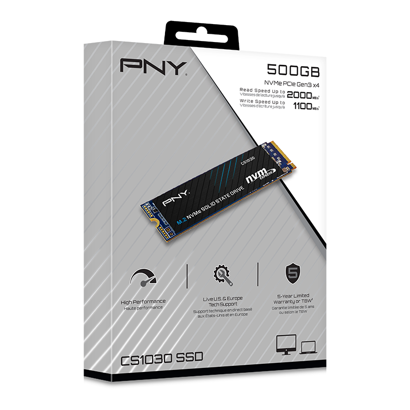 The PNY CS1030 M.2 NVMe SSD is an excellent choice for an NVMe upgrade from a SATA based solid state drive (SSD) or traditional hard drive in an NVMe enabled desktop or laptop computer. The CS1030 drive is designed to be an upgrade from conventional SATA based storage to take advantage of the high bandwidth of the NVMe interface to help realize faster boot times, quicker application launches, and better overall system performance. Do more in less time with NVMe; boot up, power down, and load applications up to 4 times faster than with SATA based SSD’s. With no moving parts, the PNY CS1030 M.2 NVMe SSD is highly durable, less likely to fail, and supports a 5-Year Limited Warranty or TBW.