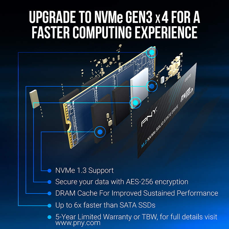 The PNY CS2130 M.2 NVMe SSD is an excellent choice for an NVMe upgrade from a SATA based solid state drive (SSD) in an existing NVMe enabled PC or MAC desktop or laptop computer. The CS2130 drive is designed to be a high performance SATA SSD replacement to help realize faster boot times, quicker application launches, and better overall system performance. Do more in less time with NVMe; boot up, power down, and load applications up to 6 times faster than with SATA based SSD’s. With no moving parts, the PNY CS2130 M.2 NVMe SSD is highly durable, less likely to fail, and supports a 5-Year Limited Warranty or TBW*.