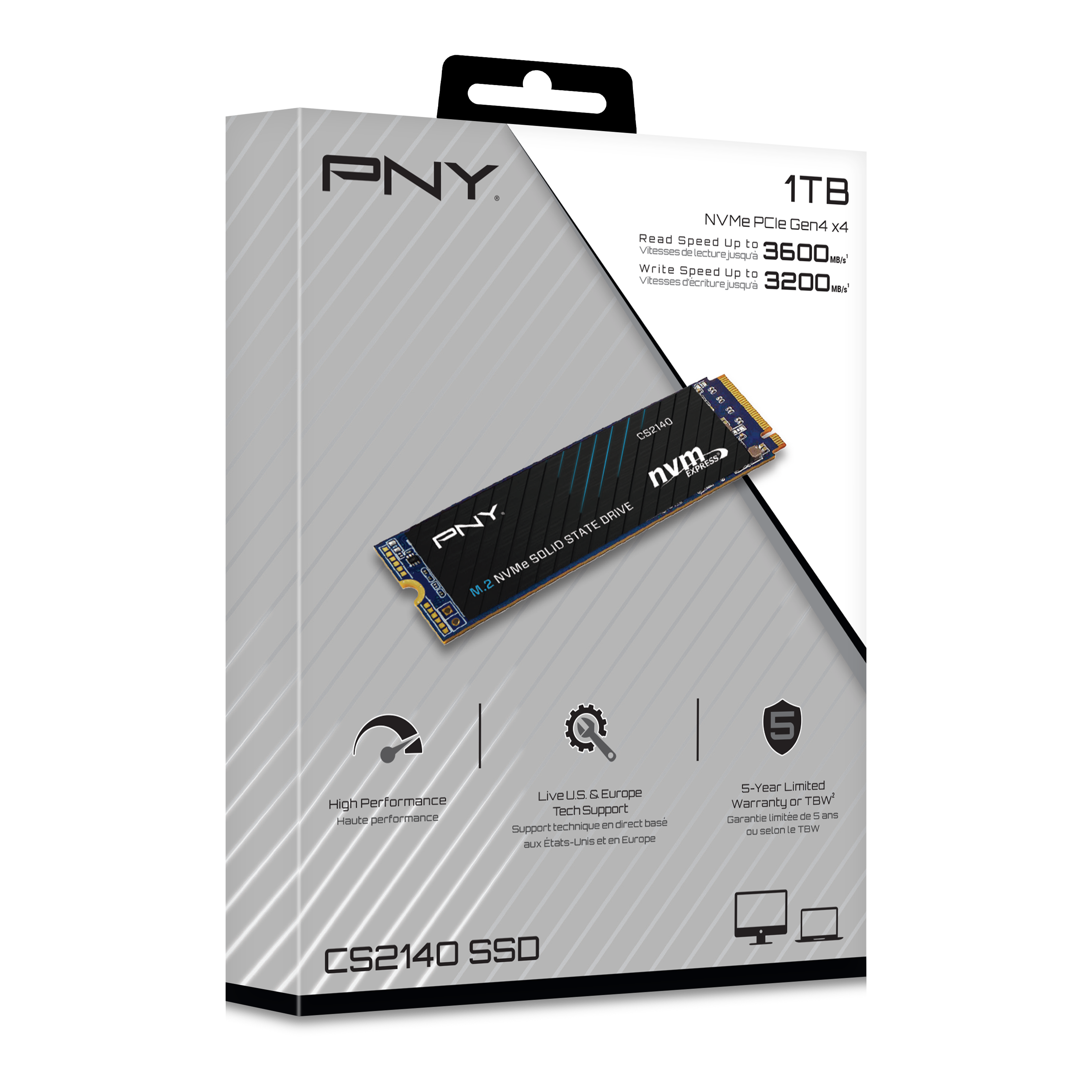 The PNY CS2140 M.2 NVMe Gen4 x4 Solid State Drive is an excellent choice for a mainstream performance upgrade in an NVMe Gen4 enabled desktop or laptop computer. Upgrade to the latest in NVMe technology and experience the enhanced performance of up to 3,600 MB/s seq. read and 3,200 MB/s seq. write speeds. Experience faster boot times, quicker application launches, and improved overall system performance using the CS2140 Gen4 technology. Do more in less time with NVMe Gen4 x4; boot up, power down, and load applications up to 6 times faster compared to SATA based SSD’s. Designed to deliver the performance you demand, and with no moving parts, the PNY CS2140 is highly durable, less likely to fail, and supports a 5-year limited warranty or TBW.