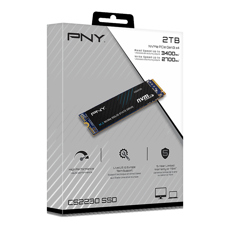 The PNY CS2230 M.2 NVMe SSD is an excellent choice for an NVMe upgrade from a SATA based solid state drive (SSD) in an existing NVMe enabled PC or MAC desktop or laptop computer. The CS2230 drive is designed to be a SATA SSD replacement to help realize faster boot times, quicker application launches, and better overall system performance. Do more in less time with NVMe; boot up, power down, and load applications up to 6 times faster than with SATA based SSD’s. With no moving parts, the PNY CS2230 M.2 NVMe SSD is highly durable, less likely to fail, and supports a 5-Year Limited Warranty or TBW.