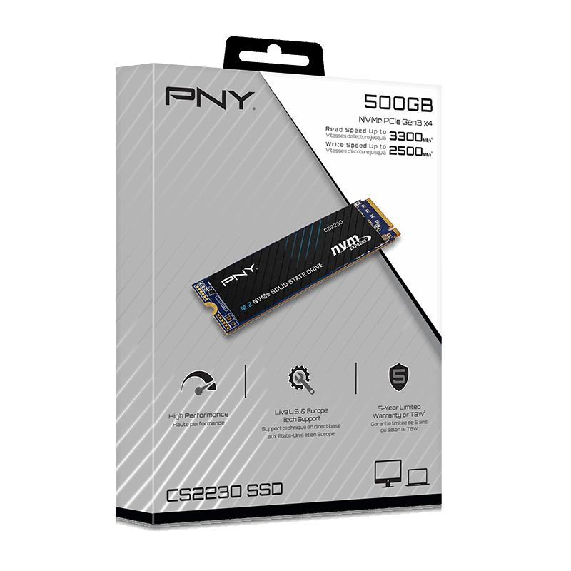 The PNY CS2230 M.2 NVMe SSD is an excellent choice for an NVMe upgrade from a SATA based solid state drive (SSD) in an existing NVMe enabled PC or MAC desktop or laptop computer. The CS2230 drive is designed to be a SATA SSD replacement to help realize faster boot times, quicker application launches, and better overall system performance. Do more in less time with NVMe; boot up, power down, and load applications up to 6 times faster than with SATA based SSD’s. With no moving parts, the PNY CS2230 M.2 NVMe SSD is highly durable, less likely to fail, and supports a 5-Year Limited Warranty or TBW.