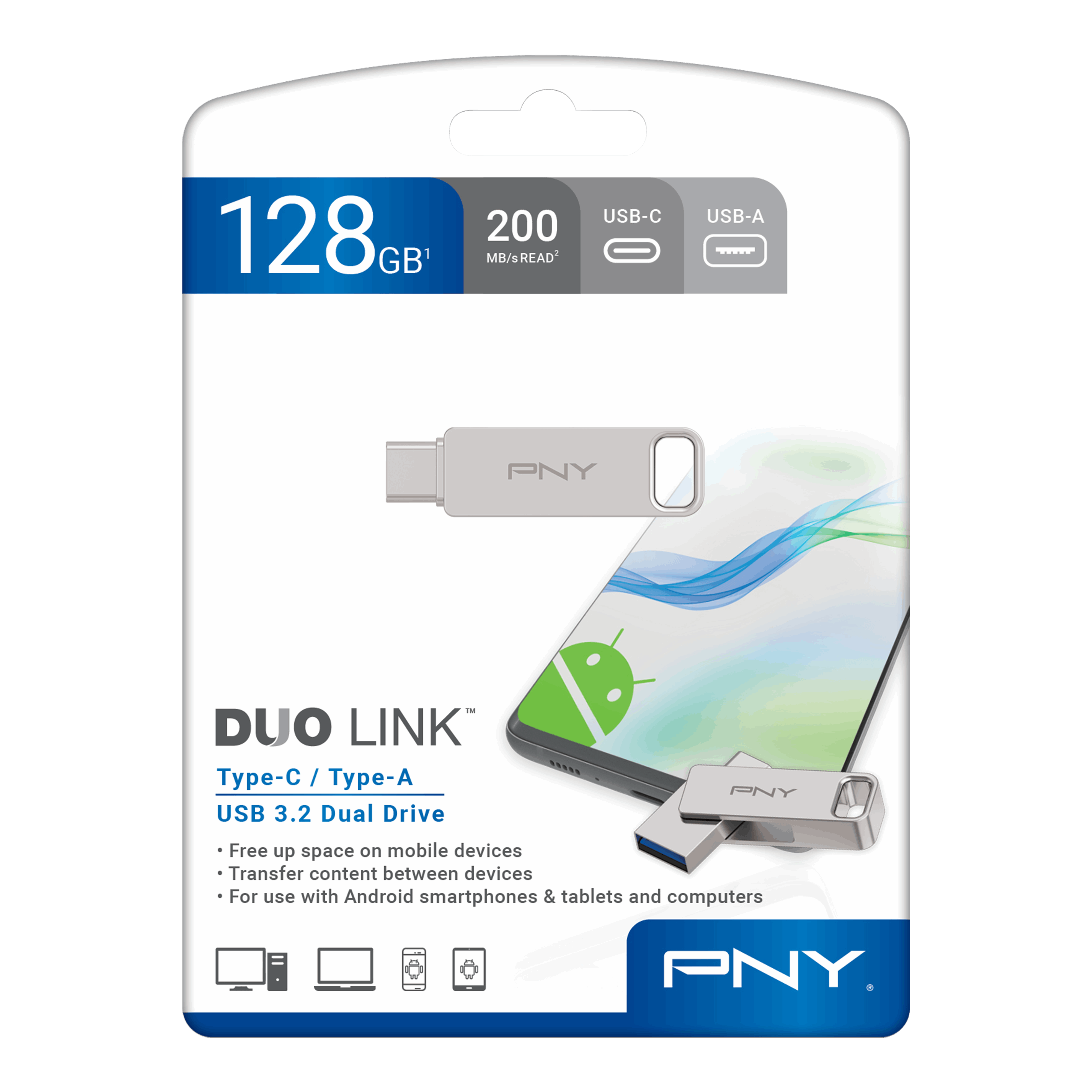 The PNY DUO LINK USB 3.2 Type-C Dual Flash Drive bridges the gap between mobile and desktop, making it the ideal mobile storage solution for file management on-the-go. DUO LINK is the perfect tool to free up space on Type-C equipped mobile devices by allowing users to move content such as photos, videos, music, and more from their smartphones and tablets to the drive, making room for more, and ensuring they will never miss an opportunity to capture content due to lack of memory. What’s more, the DUO LINK Dual Flash Drive allows for the transfer of content to full size devices such as laptop and desktop computers for permanent storage. With read speeds of up to 200MB/s and transfers up to 30x faster than USB 2.0, moving content from the drive to a computer is quick and easy. From there, users can take their content to the next level and create videos, social posts, process prints, or simply save their files on a more permanent storage device. The DUO Link USB 3.2 Type-C Dual Flash Drive is ideal for use across operating systems and host devices. With a USB 3.2 Type-C connector for Type-C Android mobile devices and newer gen PC & Mac laptop and desktop computers, and a USB 3.2 Type-A connector for previous gen computers, the potential for content creation and file management is near limitless.