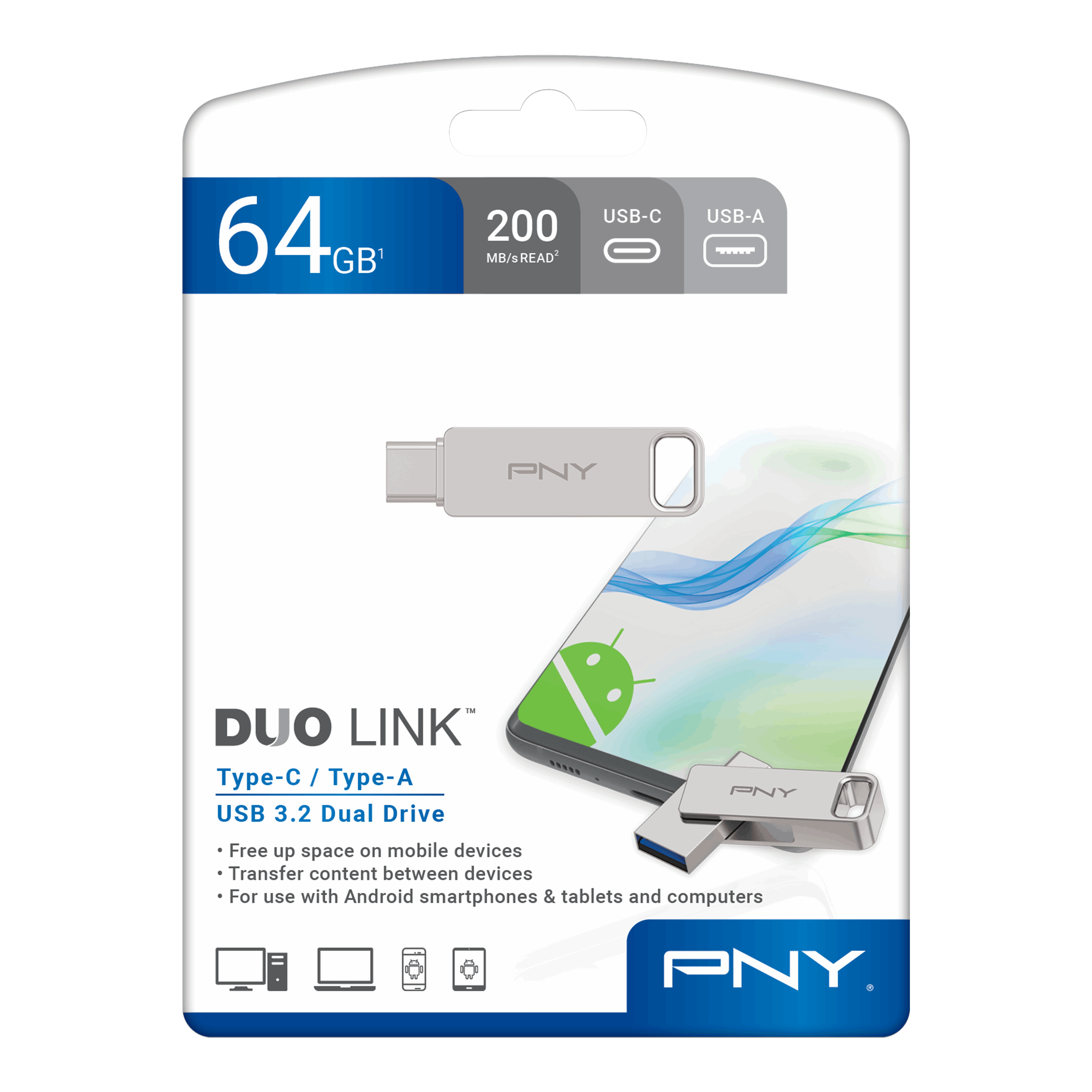 The PNY DUO LINK USB 3.2 Type-C Dual Flash Drive bridges the gap between mobile and desktop, making it the ideal mobile storage solution for file management on-the-go. DUO LINK is the perfect tool to free up space on Type-C equipped mobile devices by allowing users to move content such as photos, videos, music, and more from their smartphones and tablets to the drive, making room for more, and ensuring they will never miss an opportunity to capture content due to lack of memory. What’s more, the DUO LINK Dual Flash Drive allows for the transfer of content to full size devices such as laptop and desktop computers for permanent storage. With read speeds of up to 200MB/s and transfers up to 30x faster than USB 2.0, moving content from the drive to a computer is quick and easy. From there, users can take their content to the next level and create videos, social posts, process prints, or simply save their files on a more permanent storage device. The DUO Link USB 3.2 Type-C Dual Flash Drive is ideal for use across operating systems and host devices. With a USB 3.2 Type-C connector for Type-C Android mobile devices and newer gen PC & Mac laptop and desktop computers, and a USB 3.2 Type-A connector for previous gen computers, the potential for content creation and file management is near limitless.