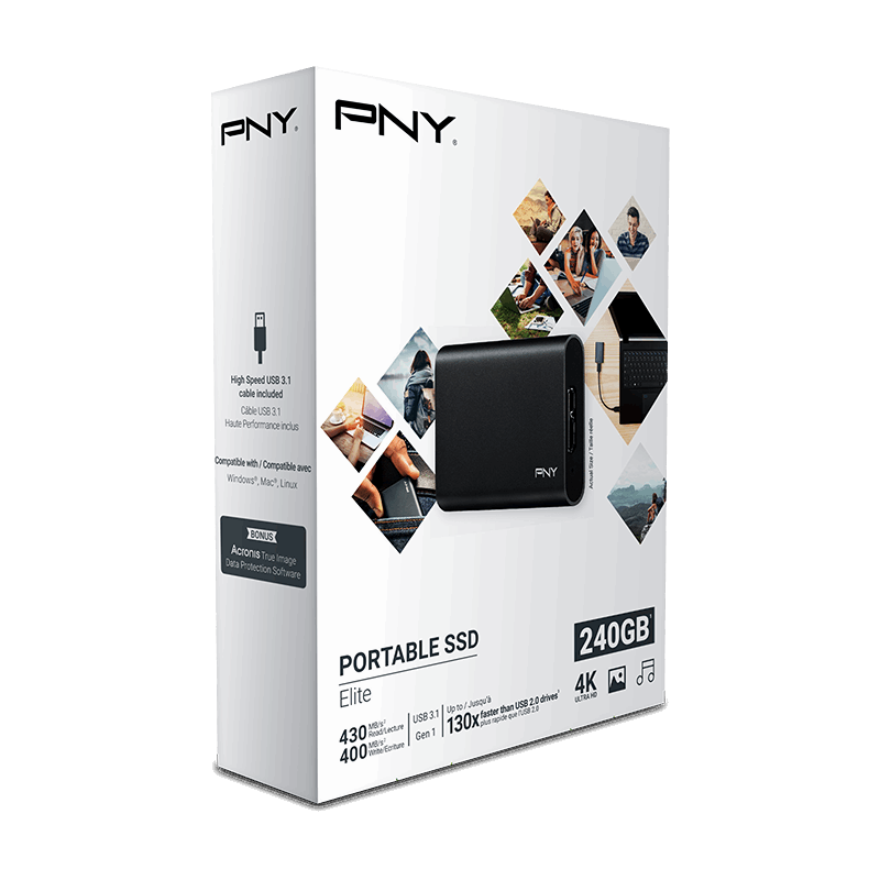 PNY's Elite Portable SSD offers a storage capacity of up to 240GB in a pocket-sized design. This powerful USB 3.1 Gen 1 powered drive offers blazing-fast transfer speeds of up to 430 MB/s*. It's the ideal solution for photographers, videographers, graphic designers or any mainstream computer user who needs to back-up or transfer large files. Take all of your data with you whenever you need it and have the ability to offload it quickly. *For full details visit www.pny.com