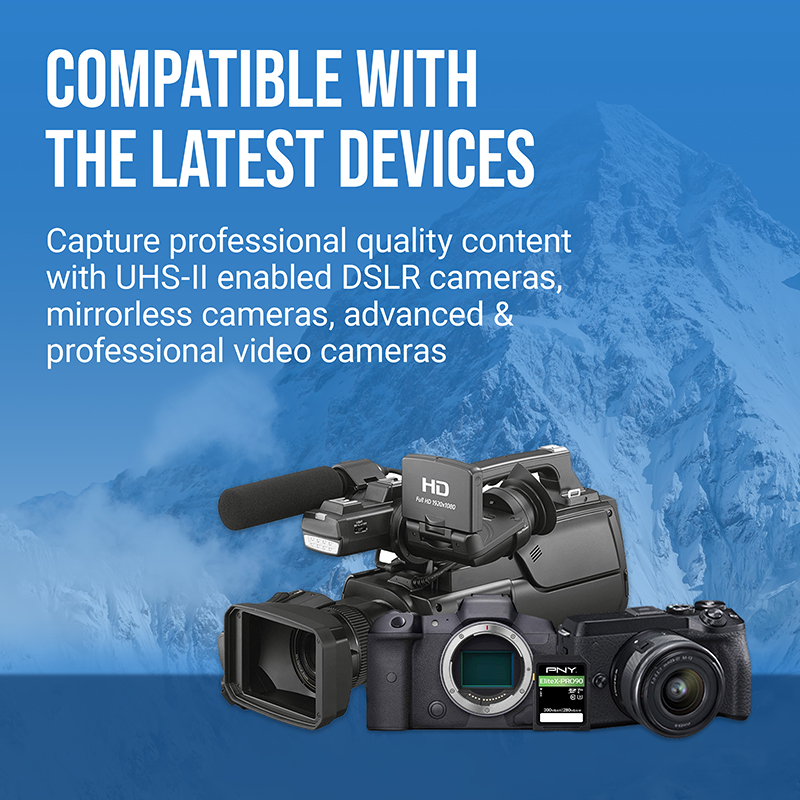 *Based on PNY’s internal testing; performance may vary depending upon host device. Not all host devices can achieve 300MB/s sequential read and 280MB/s sequential write speeds. 1x = 150KB/sec. **Compatible with UHS-II host devices enabled with a SDXC slot. Backward compatible with UHS-I host devices at UHS-I speeds. ***Requires compatible device capable of reaching such speeds when used in conjunction with a computer.