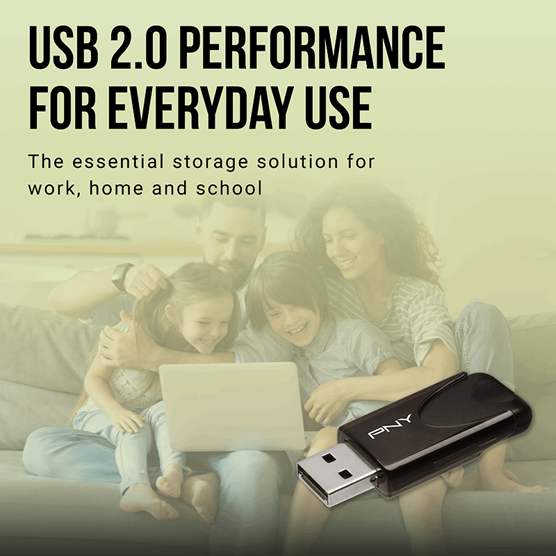 The PNY Attaché 4 USB 2.0 Flash Drive is the essential solution for storing and sharing digital content for work and school. Durable and light-weight, it delivers the perfect combination of storage and convenience. The sliding collar, and cap-less design protects your important content when not in use, and the included key loop easily attaches to key chains, so important files are never out of reach. The Attaché 4 USB 2.0 Flash Drive is compatible with USB 2.0 equipped PC and Mac laptop and desktop computers, and compatible with USB 3.0 host devices at standard USB 2.0 speeds.