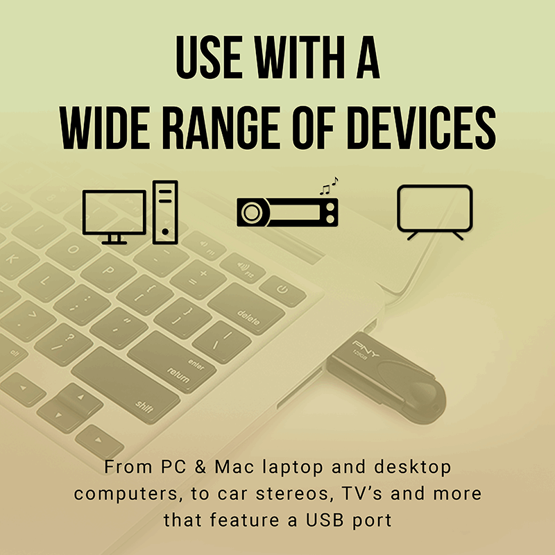 *For Flash Media Devices, 1 megabyte = 1 million bytes; 1 gigabyte = 1 billion bytes. Actual useable capacity may vary. Some of the listed capacity is used for formatting and other functions, and thus is not available for data storage. **Speed is based on PNY standard USB 2.0 (3MB/s) write speed.