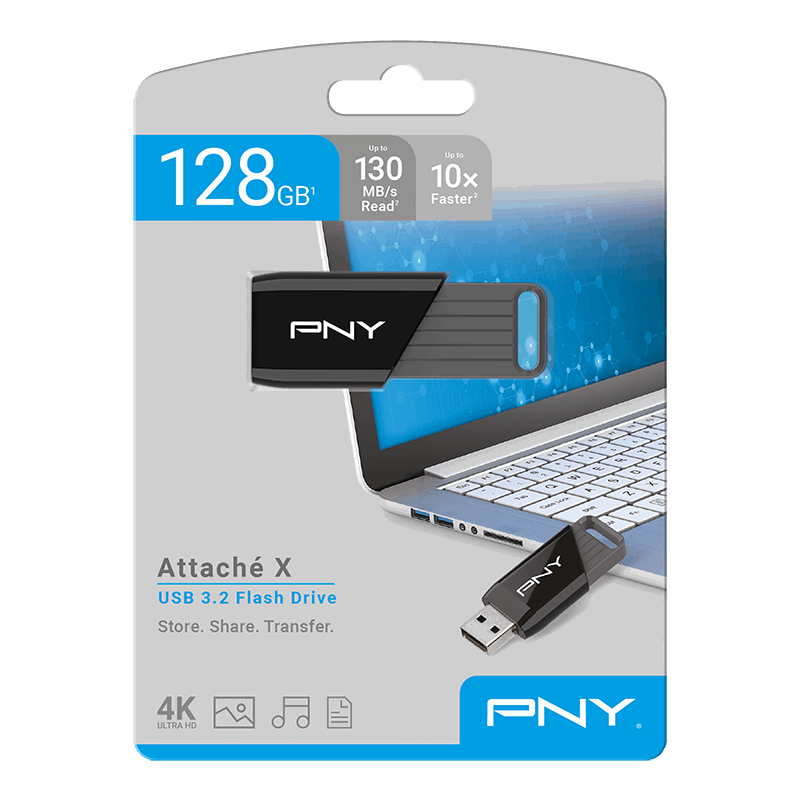PNY's Attaché X offers advanced USB 3.2 Gen 1 performance up to 130MB/s read & up to 10x faster transfer speeds than USB 2.0. Built for speed and convenience, easily store & quickly transfer large files, high-resolution photos, HD videos, & more faster than before. Crafted with convenience and portability in mind, the modern, reliable, light-weight flash drive incorporates a sliding collar cap-less design that means no more lost caps!1,2