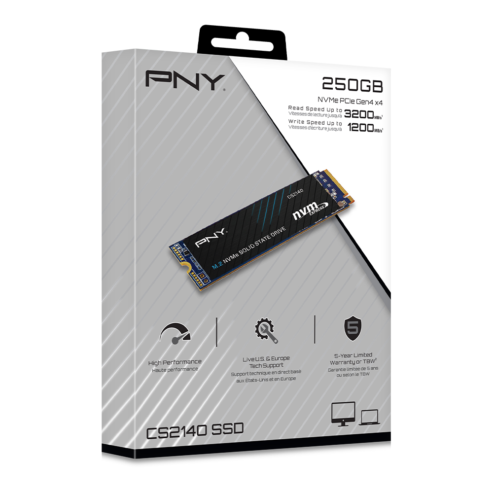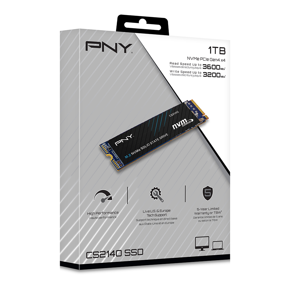 The PNY CS2140 M.2 NVMe Gen4 x4 Solid State Drive is an excellent choice for a mainstream performance upgrade in an NVMe Gen4 enabled desktop or laptop computer. Upgrade to the latest in NVMe technology and experience the enhanced performance of up to 3,600 MB/s seq. read and 3,200 MB/s seq. write speeds. Experience faster boot times, quicker application launches, and improved overall system performance using the CS2140 Gen4 technology. Do more in less time with NVMe Gen4 x4; boot up, power down, and load applications up to 6 times faster compared to SATA based SSD’s. Designed to deliver the performance you demand, and with no moving parts, the PNY CS2140 is highly durable, less likely to fail, and supports a 5-year limited warranty or TBW*.