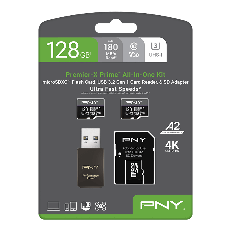 Achieve extreme performance - U3, V30 speed class performance with read speeds up to 180MB/s when used with PNY Performance Prime USB 3.2 Gen 1 microSD Card Reader.¹