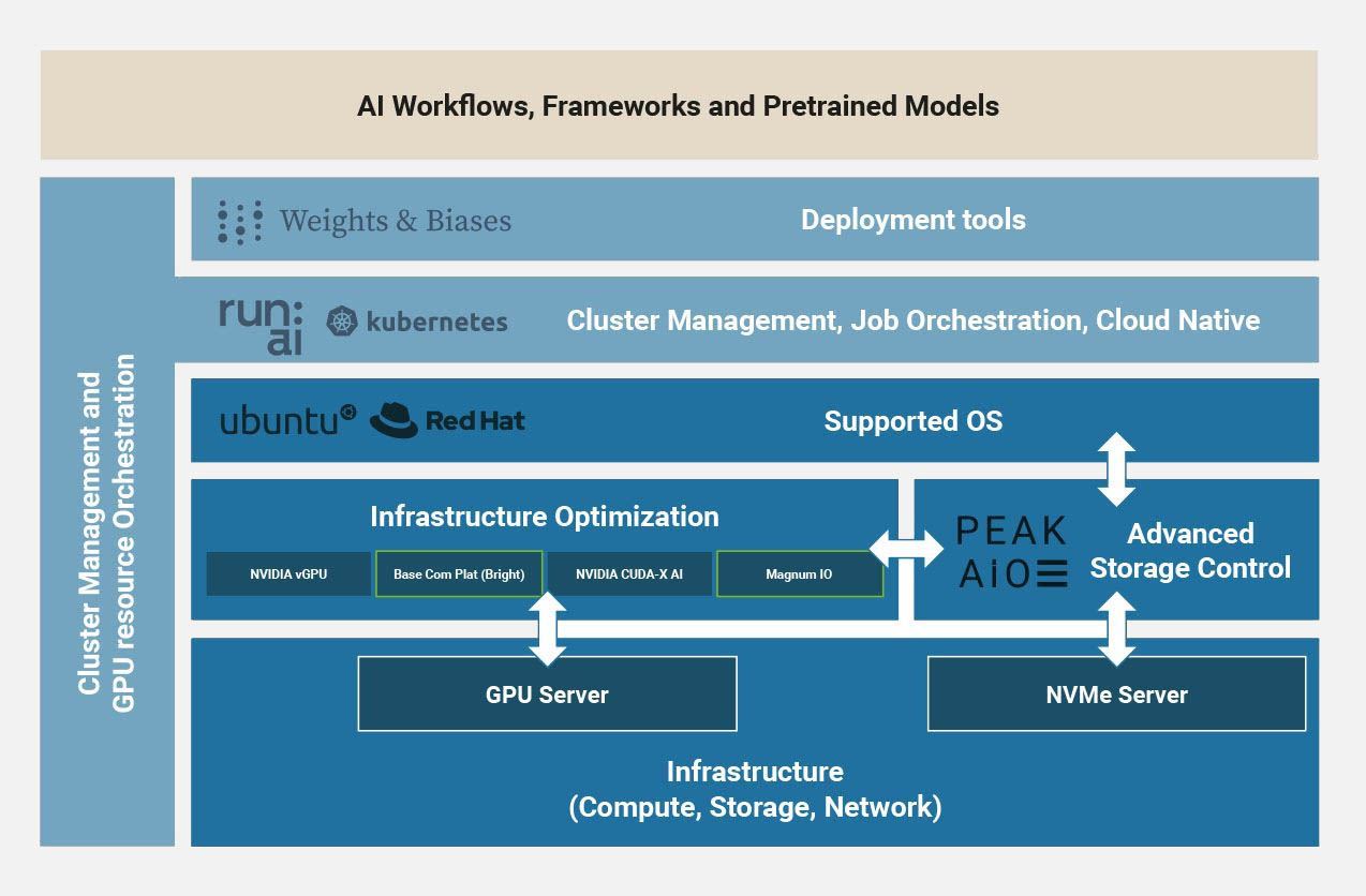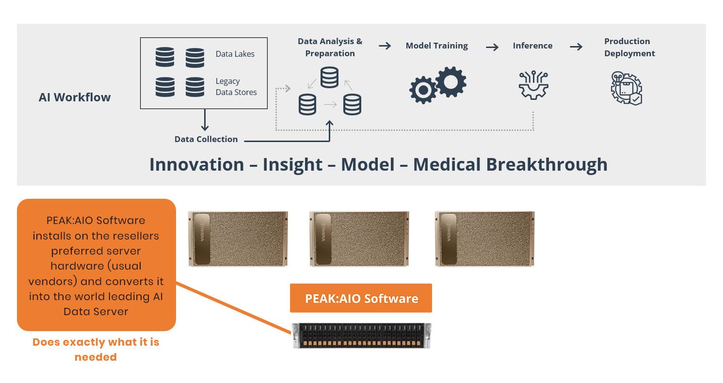 PEAK:AIO is a software package that converts a standard NVMe storage server into an ultra-performance AI Data Server; a solution designed for the new era of GPUs, replacing the traditional storage appliance, at a price point suited to a market with tight budgets. Developed from scratch for the NVIDIA eco-system, including Magnum-io - GPUDirect and RDMA NFS, it delivers the blistering performance normally associated with HPC storage at a fraction of the cost, and being fully NVIDIA OS native means near zero administration and plug and forget simplicity.