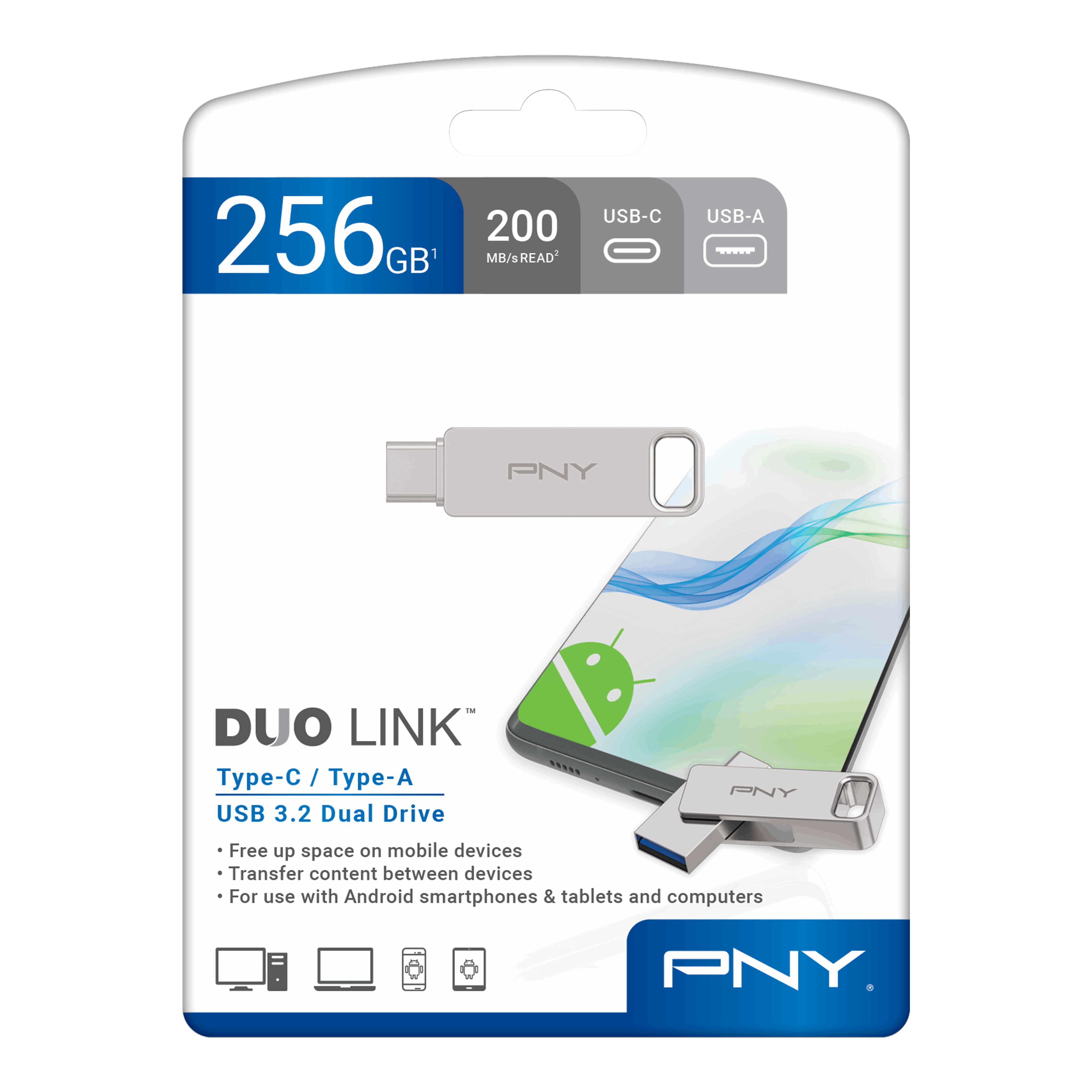 The PNY DUO LINK USB 3.2 Type-C Dual Flash Drive bridges the gap between mobile and desktop, making it the ideal mobile storage solution for file management on-the-go. DUO LINK is the perfect tool to free up space on Type-C equipped mobile devices by allowing users to move content such as photos, videos, music, and more from their smartphones and tablets to the drive, making room for more, and ensuring they will never miss an opportunity to capture content due to lack of memory. What’s more, the DUO LINK Dual Flash Drive allows for the transfer of content to full size devices such as laptop and desktop computers for permanent storage. With read speeds of up to 200MB/s and transfers up to 30x faster than USB 2.0, moving content from the drive to a computer is quick and easy. From there, users can take their content to the next level and create videos, social posts, process prints, or simply save their files on a more permanent storage device. The DUO Link USB 3.2 Type-C Dual Flash Drive is ideal for use across operating systems and host devices. With a USB 3.2 Type-C connector for Type-C Android mobile devices and newer gen PC & Mac laptop and desktop computers, and a USB 3.2 Type-A connector for previous gen computers, the potential for content creation and file management is near limitless.