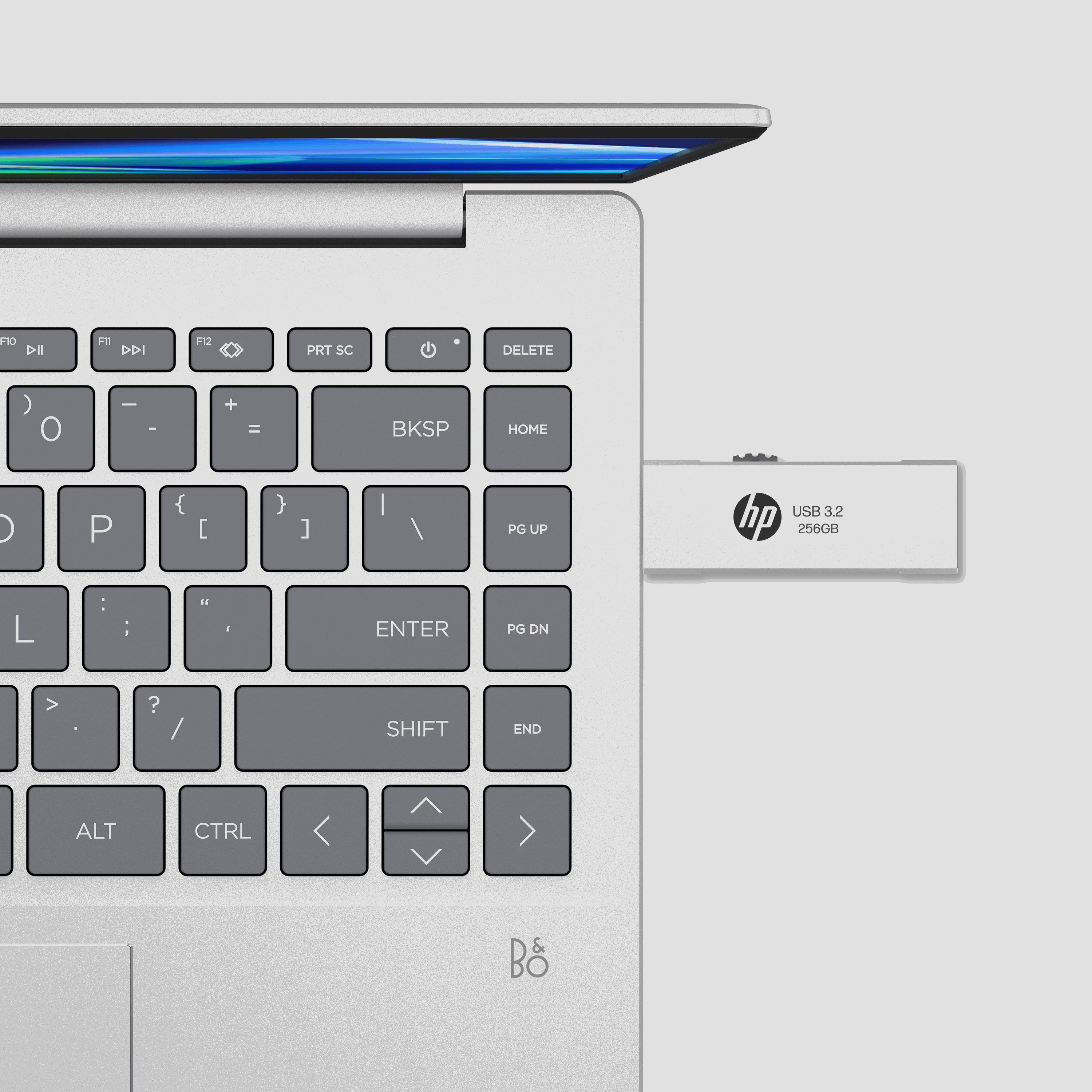The HP 818w is a USB 3.2 Pen Drive with a matte silver texture referencing HP laptops. The USB connector can slide in and out freely while providing protection from damage. No cap to lose!