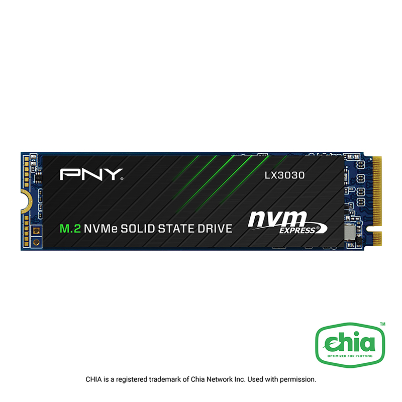 The PNY LX3030 M.2 NVMe SSD is the ideal solution for “proof of space and time” applications like plotting Chia Coin. Unlike “proof of work” models like bitcoin which consume large amounts of power by requiring the miners to do complex mathematical calculations, “proof of space and time” applications utilize the unused space on a users’ systems, making it a more energy efficient and environmentally conscious model. To secure the blockchain, the data needs to be first created in a process called “plotting”, which is only required once per plot file. This process is write intensive, so a desirable SSD for plotting has high sustained write bandwidth and endurance (TBW, or terabytes written). Typically this level of write performance and endurance was only seen on enterprise class SSDs.