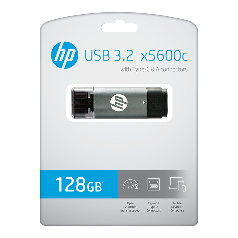 The HP x5600c USB 3.2 Gen 1 Type-C Dual Flash Drive is a two-in-one solution for maximum versatility and double the connectivity. Not only is it a dual sided flash drive designed to free up space on your Type-C equipped Android smartphone or tablet by allowing you to transfer your content to your PC or Mac computer via either the Type-C or Type-A connectors, the USB-A equipped adapter is removable, allowing you to use it as a standard USB flash with older devices. The HP x5600c is super fast, as well as incredibly versatile. Offering read speeds up to 220MB/s and write speeds up to 150MB/s, it is the ideal solution to transfer and store photos, videos and more. With dual connectors, a USB 3.2 Type-C connector for Type-C equipped Android devices and PC & Mac computers, and a USB 3.2 Type-A connector for previous gen computers, this drive is compatible with a wide range of host devices and ideal for various different applications. By transferring your videos, photos, music and more to the HP x5600 USB 3.2 Dual Flash Drive, you can spend less time worrying about running out of space on your mobile device and more time making new memories.