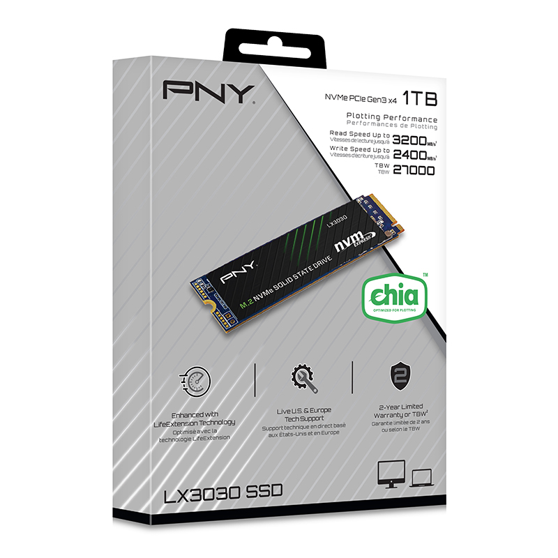 The PNY LX3030 M.2 NVMe SSD is the ideal solution for “proof of space and time” applications like plotting Chia Coin. Unlike “proof of work” models like bitcoin which consume large amounts of power by requiring the miners to do complex mathematical calculations, “proof of space and time” applications utilize the unused space on a users’ systems, making it a more energy efficient and environmentally conscious model. To secure the blockchain, the data needs to be first created in a process called “plotting”, which is only required once per plot file. This process is write intensive, so a desirable SSD for plotting has high sustained write bandwidth and endurance (TBW, or terabytes written). Typically this level of write performance and endurance was only seen on enterprise class SSDs.