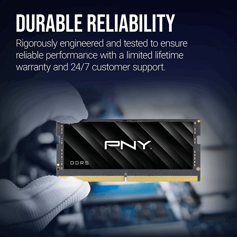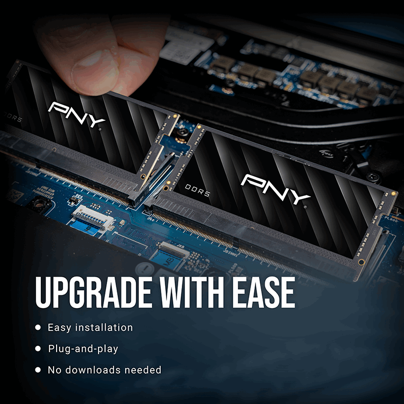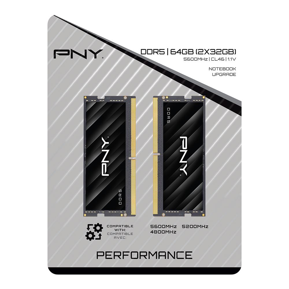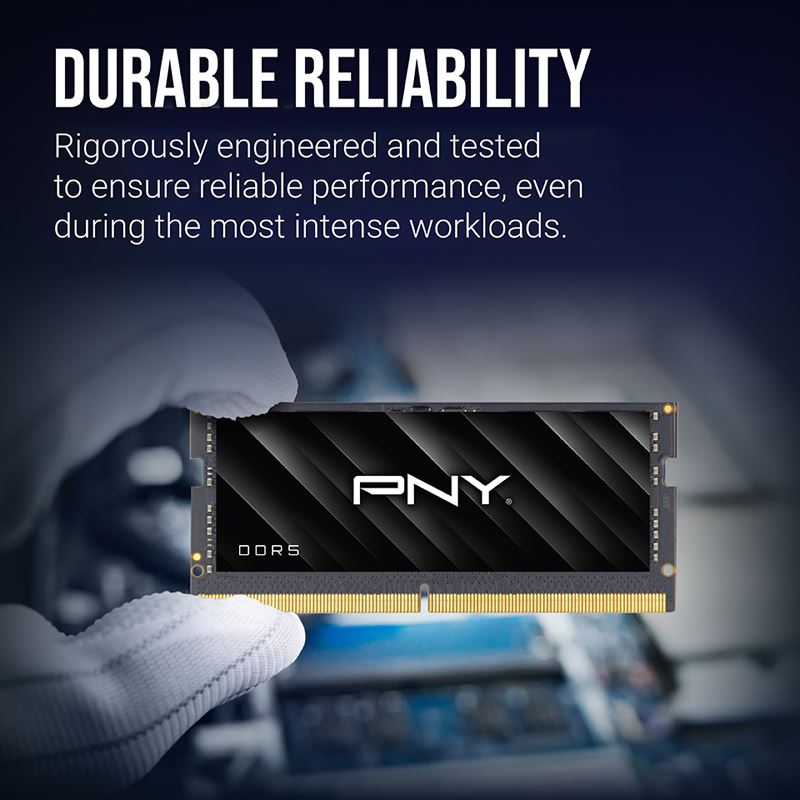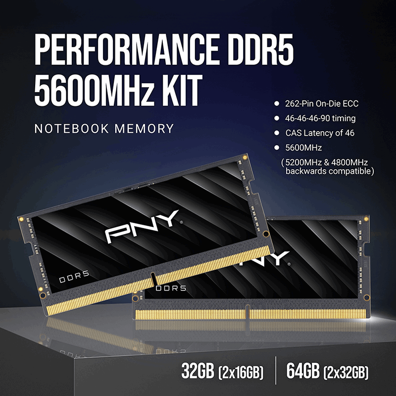Elevate your computing experience with PNY Performance DDR5; built to support the growing lineup of motherboards with speeds up to 5600MHz and a CAS latency of 46. With cutting-edge technology showcasing a host of new features previously unavailable in earlier generations of notebook memory. Upgrade your system with PNY Performance DDR5 Notebook Memory for higher-density modules, faster standard frequencies, and rock-solid reliability.