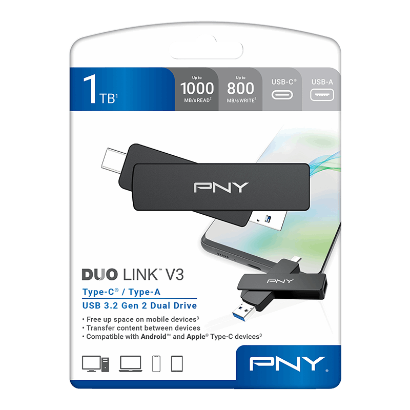 PNY DUO LINK™ V3 Type-C® OTG USB 3.2 Gen 2 Flash Drive is the ultimate on-the-go storage solution for advanced tech users. Enjoy extreme performance up to 1000MB/s read and up to 800MB/s write. Dual Type-A & Type-C connectors maximize compatibility to seamlessly manage files across host devices on up to 2TBs of storage space. With a premium metal swivel design for durability & portability.¹,²,³,⁴
