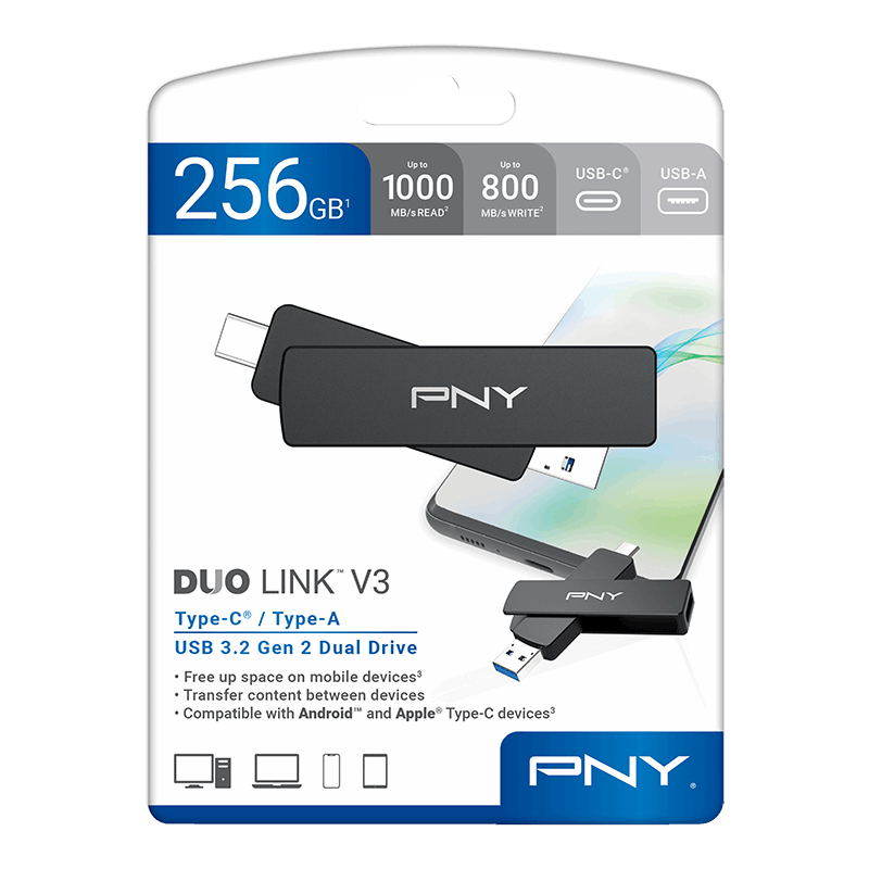 PNY’s DUO LINK™ V3 Type-C® OTG USB 3.2 Gen 2 Flash Drives provide the ultimate mobile storage solution with blazing fast performance and maximum compatibility. Engineered with the latest USB 3.2 Gen 2 technology to achieve extreme speeds up to 1000MB/s read and up to 800MB/s write, an astounding 265x faster than standard USB 2.0 flash drives.2