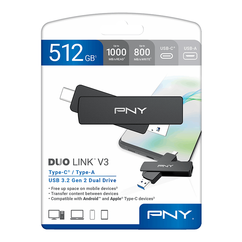 PNY DUO LINK™ V3 Type-C® OTG USB 3.2 Gen 2 Flash Drive is the ultimate on-the-go storage solution for advanced tech users. Enjoy extreme performance up to 1000MB/s read and up to 800MB/s write. Dual Type-A & Type-C connectors maximize compatibility to seamlessly manage files across host devices on up to 2TBs of storage space. With a premium metal swivel design for durability & portability.¹,²,³,⁴