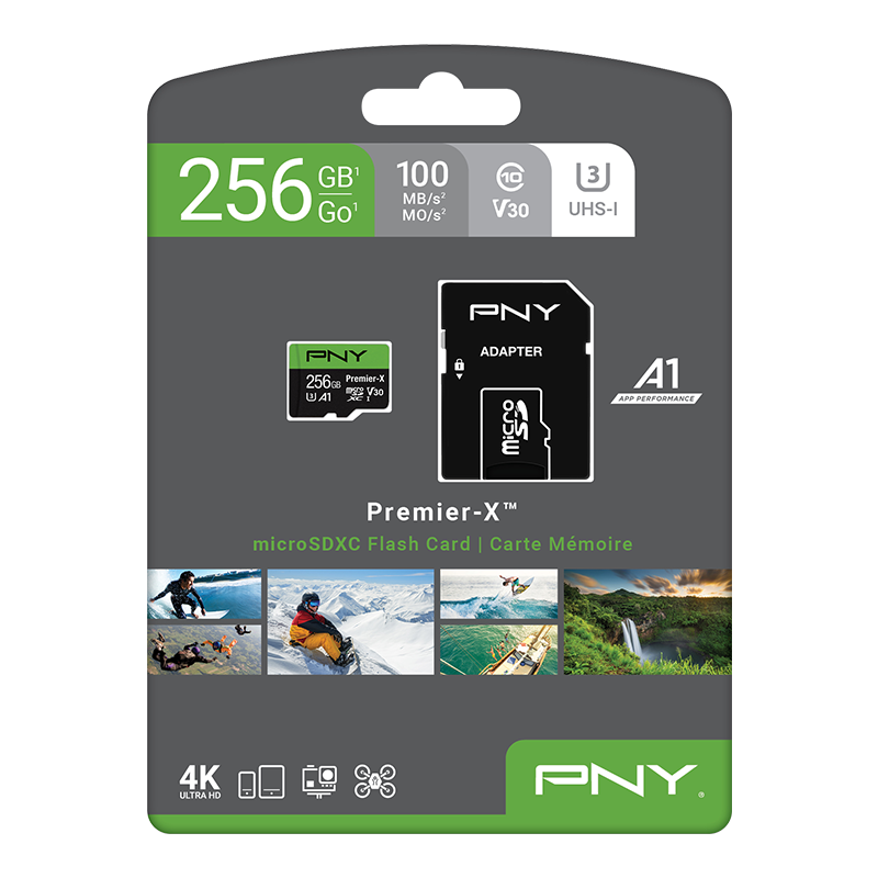 The PNY Premier-X Class 10 U3 V30 microSD Flash Memory Cards are the perfect solution by which to expand on-board memory of mobile devices such as smartphones, tablets, action cameras, drones, and more, allowing users to free up space to enjoy more digital content. The Premier-X microSD Flash Memory Cards are rated Class 10, U3, V30, with read speeds of up to 100MB/s, guaranteeing that users can not only quickly and easily store and share content between devices, but also engage in HD photography and 4K Ultra HD Videography by leveraging the U3 technology. What’s more, the Premier-X microSD Flash Memory Cards feature V30 Video Speed Class, ideal for 4K Ultra HD video at 4096x3072 format, allowing users to capture high quality content on their mobile devices. Rated A1 (A2 for 512GB), the PNY Premier-X is optimized for app performance, allowing users to run apps directly from the microSD card, delivering faster app launch and performance than ever before.