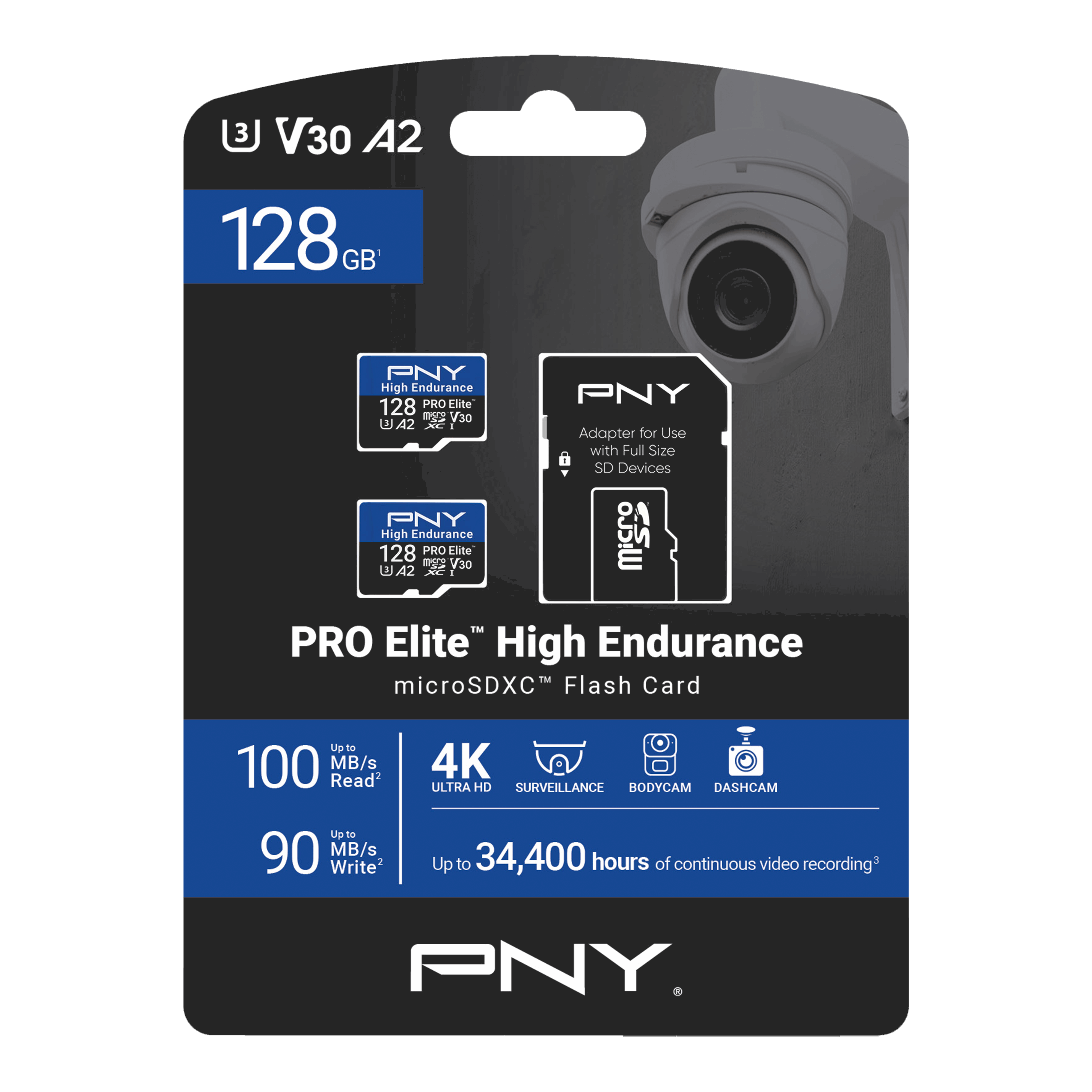 PNY PRO Elite™ High Endurance Class 10 U3 V30 A2 microSD Cards Flash Memory Cards are engineered for capturing continuous recording on surveillance and monitoring devices.4