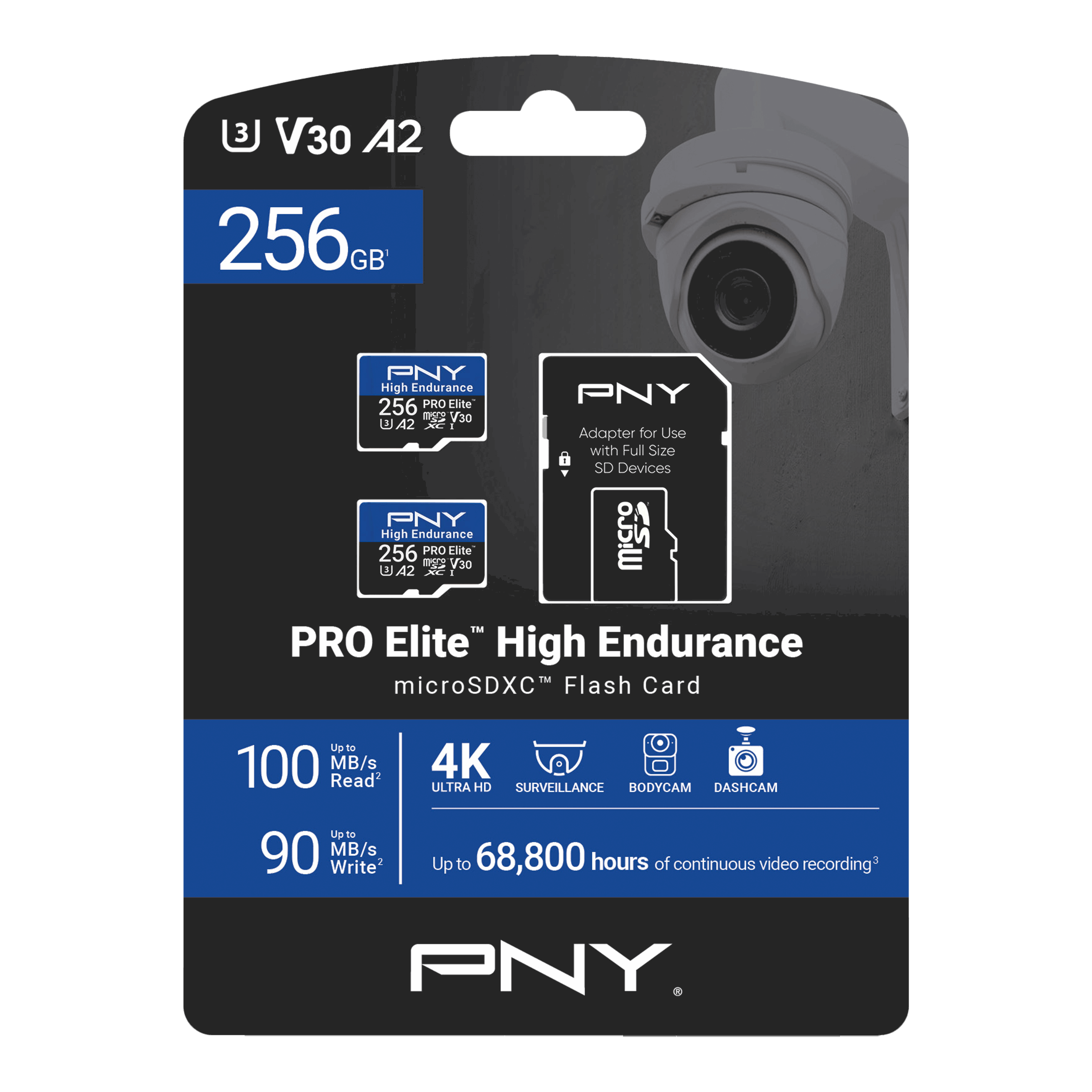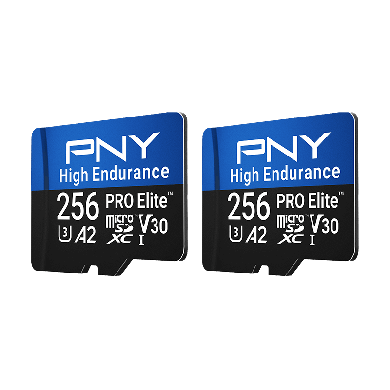 PNY PRO Elite™ High Endurance Class 10 U3 V30 A2 microSD Cards Flash Memory Cards are engineered for capturing continuous recording on surveillance and monitoring devices.4