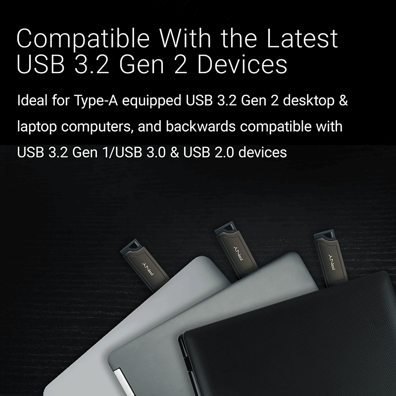 *Based on PNY internal testing; performance may be lower depending on the host devices and user’s settings and configurations. Speed quoted for USB 3.2 Gen 2 devices. Speed is based on PNY standard USB 2.0 (3MB/s) write speed. Performs at USB 3.2 Gen 1/USB 3.0 or USB 2.0 speeds when used with USB 3.2 Gen 1/3.0 or 2.0 devices, respectively.**For Flash Media Devices, 1 megabyte = 1 million bytes; 1 gigabyte = 1 billion bytes. Actual useable capacity may vary. Some of the listed capacity is used for formatting and other functions, and thus is not available for data storage.