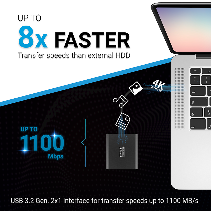 With read and write speeds of up to 1,100 MB/s and 1,000 MB/s respectively, this portable SSD provides transfer speeds of up to 30 times faster than a USB 3.0 flash drive