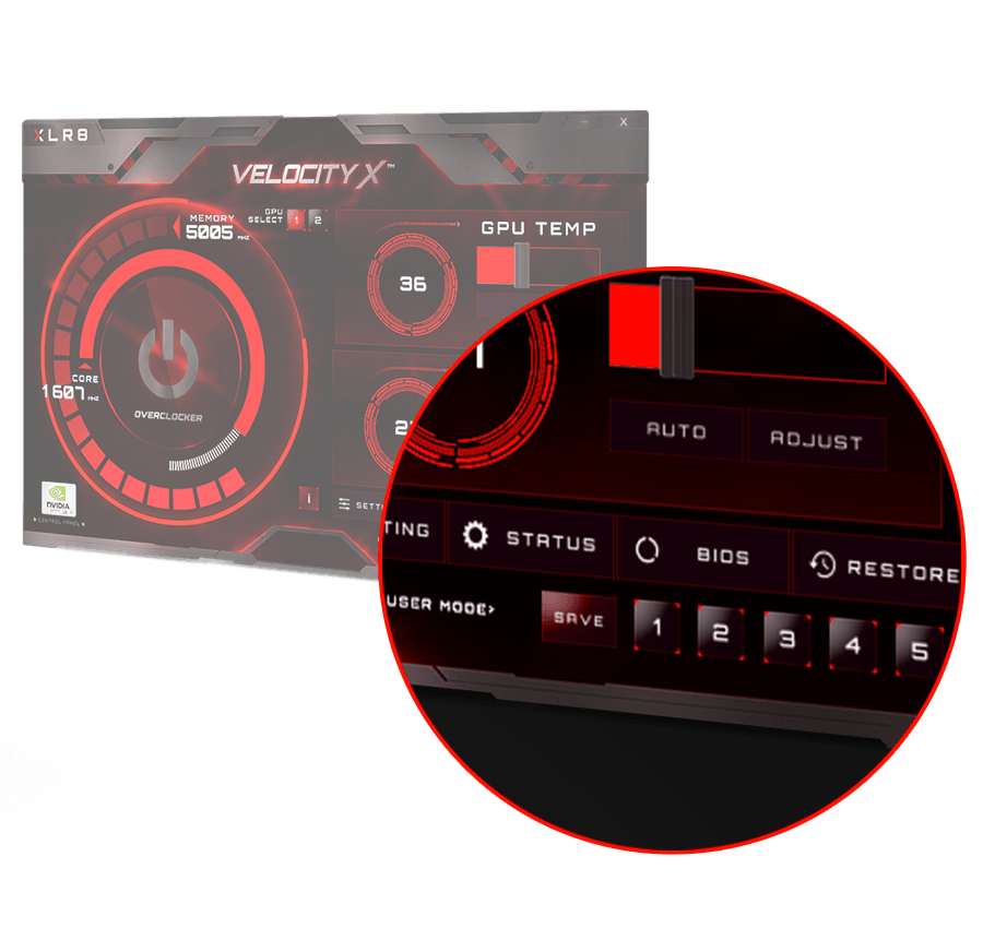 PNY’s VelocityX Overclocking Software allows you to monitor critical stats, like Core Clock, Memory Clock, Core Temperature, Fan Speed, Core Voltage, Power Usage, Core Usage, and Memory Usage in real time, generating invaluable intel that you can leverage to further fine-tune and customize your settings to master your system and take your gaming to the next level.