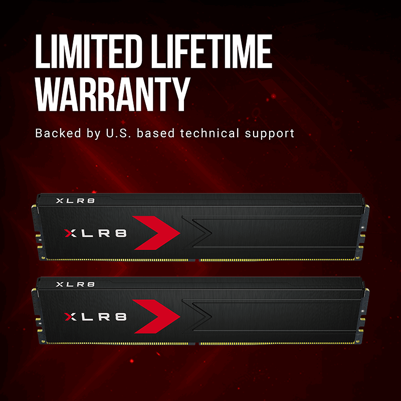 An XLR8 logo is proudly emblazoned on the side of the module, and the heat spreader features an embossed pennant design that enhances the overall look, providing unmatched flair and style. Top-tier components and select ICs combine to deliver aggressive speed, low latency and the bullet proof reliability gamers and enthusiasts can rely on PNY for.